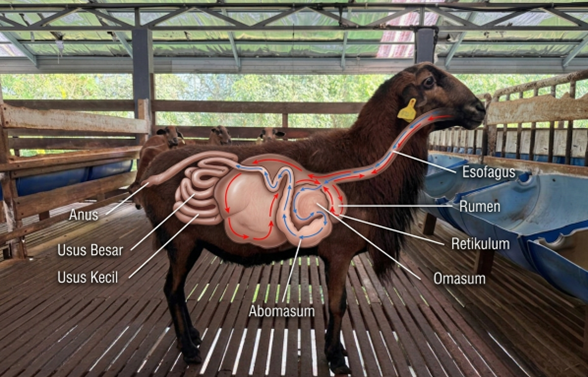 Anak panah biru (→): laluan kunyahan makanan halus ke abomasum dan usus untuk penyerapan nutrien dan protein mikrob.