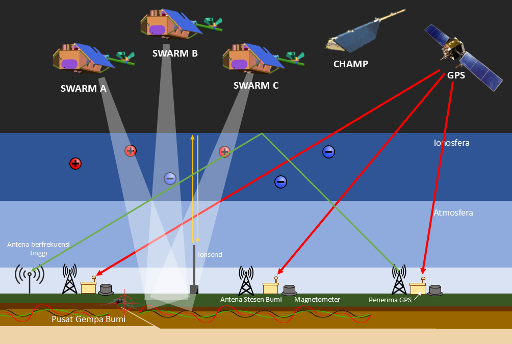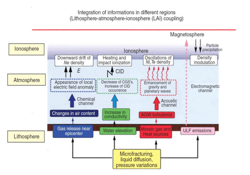 Kajian oleh saintis Rusia dan Jepun memperkenalkan konsep bahawa bumi, atmosfera, dan ionosfera saling berkait rapat sebelum berlakunya gempa (rujuk Rajah 1). Tekanan di zon rekahan dipercayai melepaskan gas seperti radon yang mempengaruhi cas elektrik atmosfera, seterusnya mengubah keadaan ionosfera, iaitu lapisan tinggi atmosfera yang kaya dengan zarah bercas.