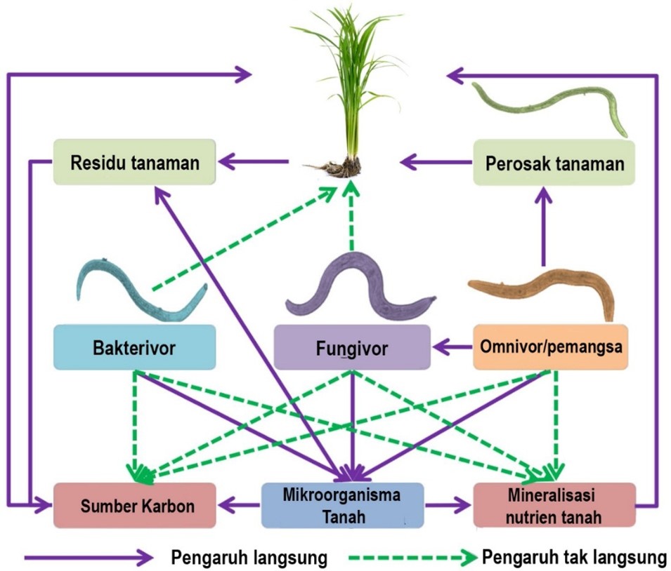 Komuniti nematod dalam tanah boleh dikelaskan kepada beberapa kumpulan utama berdasarkan aktiviti pemakanan nematod seperti nematod pemakan bakteria (bakterivor), nematod pemakan kulat (fungivor), nematod perosak tanaman, nematod omnivor dan nematod pemangsa. Setiap kumpulan nematod adalah penting dalam rantaian makanan dalam tanah dan fungsi ekosistem yang berlainan seperti dalam Rajah 1. Fungsi ekologi utama nematod ialah mengitar semula unsur karbon ke dalam tanah dan menguraikan sisa organik. Selain itu, pergerakan nematod dalam tanah turut memberi kesan dalam memperbaiki struktur tanah agar tidak terlalu padat. Umumnya, komposisi nematod dalam tanah biasanya didominasi oleh nematod pemakan kulat dan bakteria. Populasi nematod fungivor mendominasi kebanyakkan tempoh semasa penanaman padi terutamanya semasa tempoh kering sawah padi. Hal ini disebabkan peningkatan populasi kulat pengurai terutamanya selepas penuaian padi. Aktiviti pemakanan oleh nematod fungivor penting dalam penguraian sisa hasil penuaian padi di mana ianya mencetuskan letusan populasi kulat pengurai. Sisa tanaman padi yang diasimilasi ke dalam tanah semasa aktiviti pemugaran tanah meningkatkan lagi populasi nematod fungivor yang memakan kulat pengurai. Keadaan ini menjadikan struktur tanah menjadi lebih poros dan mudah ditembus berbanding keadaan tanah sebelum digembur. Nematod bakterivor kemudiannya mendominasi ekosistem tanah semasa tempoh pembajiran sawah padi di mana nematod ini lebih beradaptasi dalam keadaan anaerobik (kurang oksigen). Aktiviti penguraian dalam tanah masih lagi berlaku tetapi didominasi oleh bakteria pengurai berbanding kulat. Komuniti kulat dan bakteria disebar luas dalam tanah menerusi aktiviti pemakanan nematod di mana tidak semua kulat/bakteria dicerna dan dikeluarkan semasa pencernaan. Pergerakan nematod dalam tanah turut memberi peluang kepada kulat/bakteria untuk membiak ke kawasan baharu. Pada awal penanaman padi selepas kemasukan air, nilai pH tanah adalah sedikit berasid akibat kandungan organik yang tinggi sebelum meningkat semula dan stabil selepas setengah bulan. Pada peringkat ini, nematod perosak tanaman mula aktif membiak disebabkan kehadiran sumber makanan (akar tumbuhan) dan persekitaran tanah pH sedikit berasid. Populasi nematod ni dapat diseimbangkan dengan kehadiran nematod omnivor dan nematod pemangsa. Nematod omnivor dan pemangsa sangat sensitif terhadap gangguan alam sekitar di mana nematod jenis lebih banyak ditemui di kawasan tanah yang tidak terganggu atau kaya dengan sumber organik. Kehadiran kedua jenis nematod ini menunjukkan kesihatan tanah yang baik dan subur dari segi keseimbangan rantaian makanan dan kitar semula nutrisi dalam tanah.