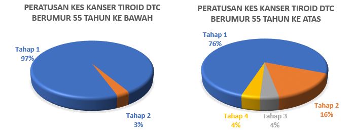 Namun disinilah letaknya keunikan dan keistimewaan kanser tiroid DTC. Bagi pesakit yang berumur 55 tahun dan ke bawah, kanser ini tidak dibahagikan kepada 4 tahap seperti kebanyakan kanser lain, sebaliknya hanya kepada 2 tahap iaitu tahap 1 dan 2.
