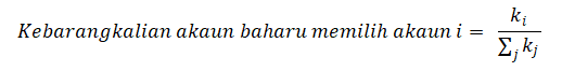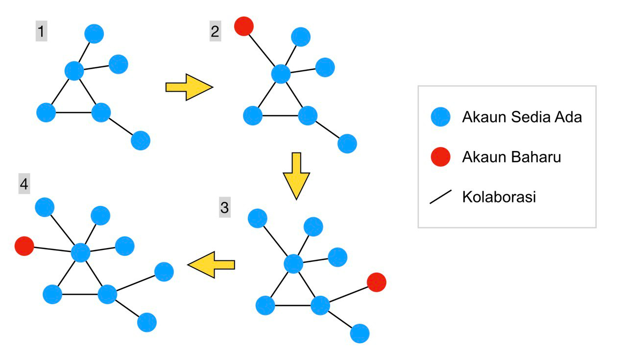dengan ki merupakan bilangan kolaborasi akaun i dan ∑jki ialah jumlah kolaborasi semua akaun dalam rangkaian. Contohnya, jika Khairul Aming mempunyai 2,000 kolaborasi, dan jumlah hubungan kesemua akaun dalam rangkaian ialah 10,000, peluang beliau dipilih oleh akaun baharu ialah 2,000 / 10,000 = 0.2 atau 20%. Mekanisme ini menyebabkan lebih banyak kolaborasi tertumpu pada akaun popular yang mempunyai jangkauan lebih luas, lalu mencetuskan rangkaian skala-bebas (scale-free) dengan taburan hukum kuasa (power law).