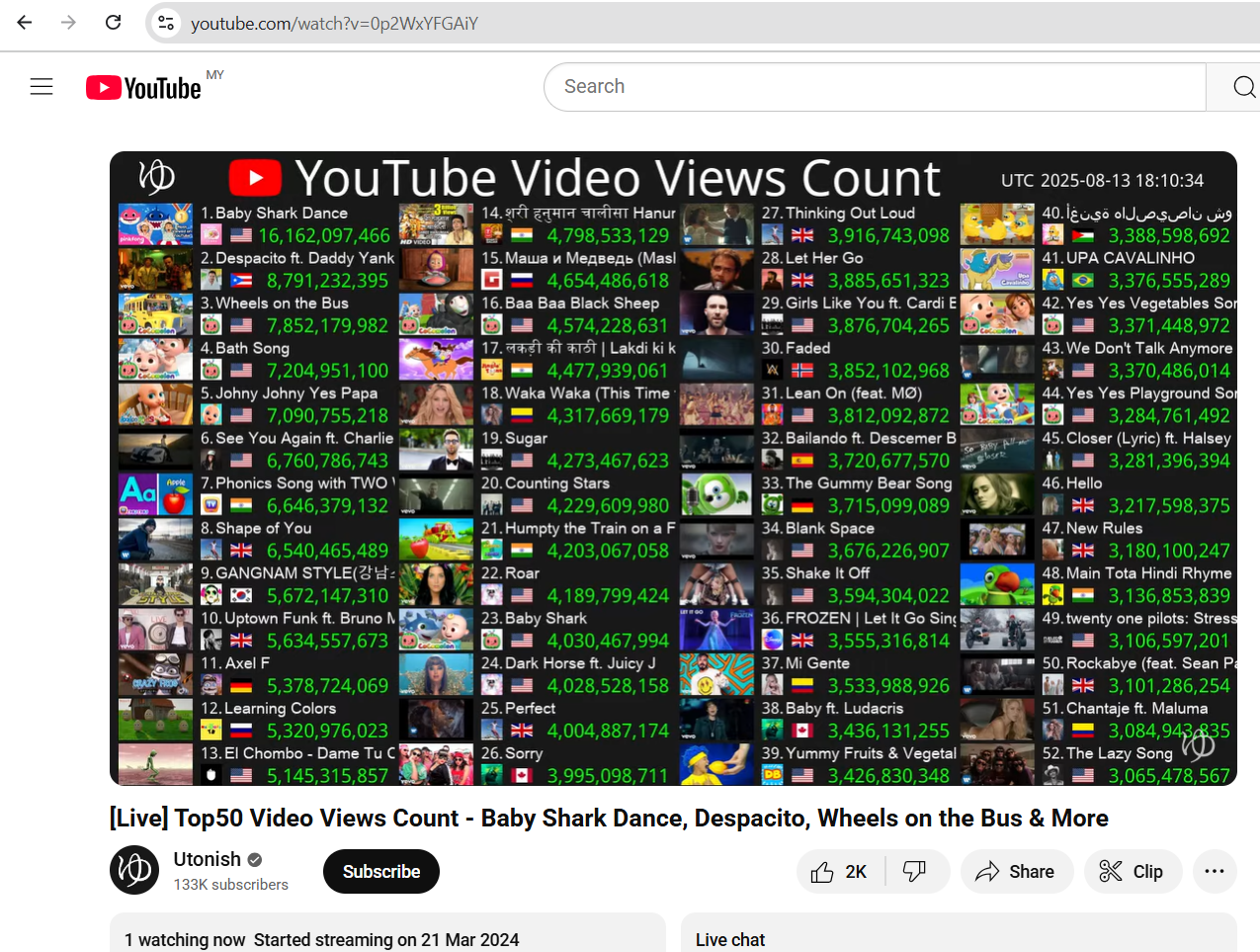 Utonish. 2024. [Live] Top50 Video Views Count – Baby Shark Dance, Despacito, Wheels on the Bus & More. YouTube. https://www.youtube.com/watch?v=0p2WxYFGAiY [14 Ogos 2025].
