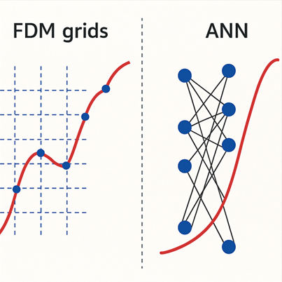Inilah sebabnya mengapa muncul pendekatan baru seperti penggunaan Artificial Neural Networks (ANN) yang boleh menjadi alternatif yang sangat menarik. ANN dapat terus menghampiri penyelesaian fungsi di seluruh domain secara berterusan, tanpa perlu memecah kawasan masalah kepada grid yang padat. Kaedah ini juga lebih mudah disesuaikan kepada masalah berdimensi tinggi dan geometri yang kompleks sekaligus mengurangkan keperluan sumber komputasi yang sangat besar.