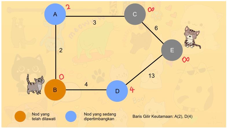 3. Lana memilih nod A sebagai destinasi seterusnya kerana jarak ke A, iaitu 2, lebih pendek berbanding jarak ke D, iaitu 4. Nod A ditandakan sebagai dilawati. Langkah 2 dan 3 diulang, Lana meletakkan nod paling hampir yang belum dilawati dalam baris gilir keutamaan.