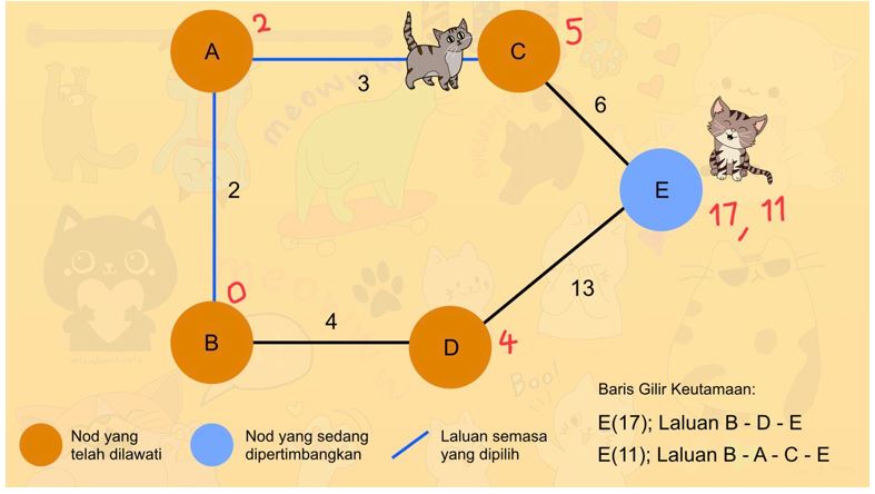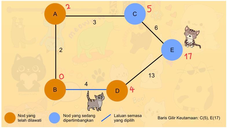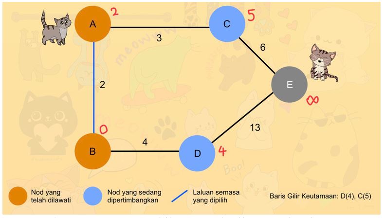 4. Jarak dari tempat asal Lana ke C melalui A ialah 5, tetapi jarak dari B ke D masih kekal 4. Maka, D dipilih terlebih dahulu. Seterusnya, nod C dan E dipertimbangkan.