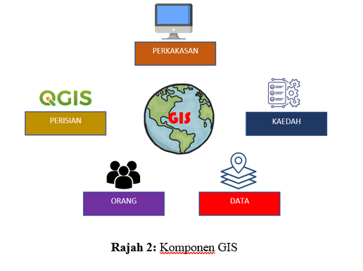 Komponen GIS terdiri daripada lima (5) bahagian iaitu perkakasan, perisian, data, orang dan kaedah seperti penerangan dibawah: