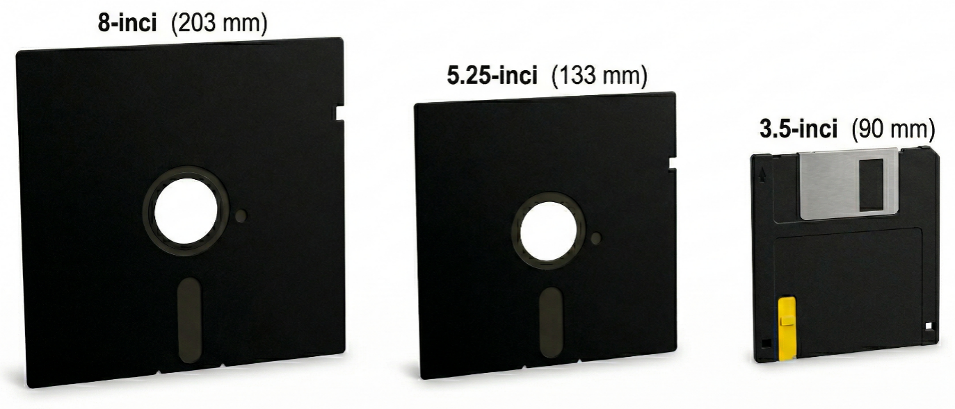 Perkembangan teknologi semasa telah mendorong kepada teknologi memori berasaskan pita magnetik contohnya disket (floppy disk). Jika anda perasan, ikon “Simpan” (Save) pada kebanyakan perisian komputer hari ini masih menggunakan gambar disket. Ini merupakan satu penghormatan kepada salah satu storan memori terawal yang meluas. Disket bermula dengan saiz 8 inci dengan kapasiti serendah 80 KB. Kemudian, saiznya mengecil kepada 5.25 inci dengan kapasiti sehingga 1.2 MB, sebelum versi 3.5 inci yang ikonik diperkenalkan dengan kapasiti piawai yang lebih tinggi iaitu 1.44 MB. Walaupun kecil mengikut piawaian hari ini, disket telah mencatat sejarah penting dalam peranti memori storan data (Rujuk Rajah 3 untuk evolusi disket).
