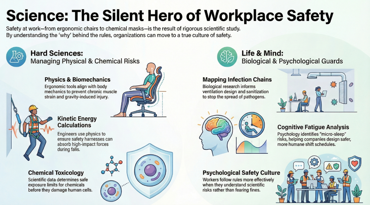 Sains dan keselamatan kerja bukanlah dua entiti yang berbeza. Malah, keselamatan pekerjaan sebenarnya adalah aplikasi sains dalam bentuk yang paling praktikal. Tanpa fizik, kimia, biologi, dan psikologi, keselamatan di tempat kerja hanyalah sekadar tekaan yang membahayakan nyawa.